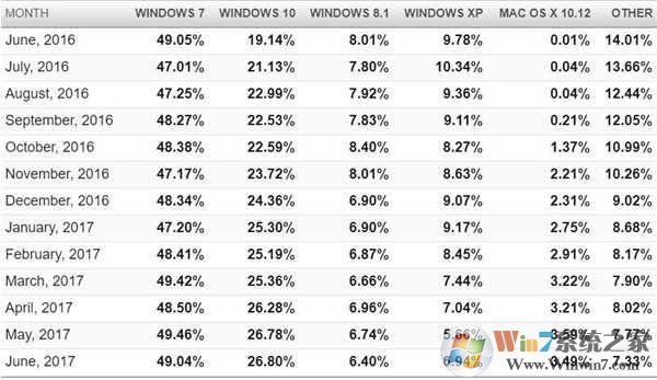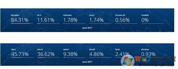 先看NetMarketShare,对比5月,Win7的份额从49.46%减少到49.04%,同时Win10用户回流,但奇怪的是,XP用户同样小幅攀升,看来勒索病毒并没有让很多用户原理。