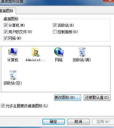 有些朋友使用的是Win7家庭基础版(Home Basic),不具备Win7主题更换功能那也不要怕,我们还是进入控制面板,然后点击“更改桌面图标”,点还原默认值就可以了。