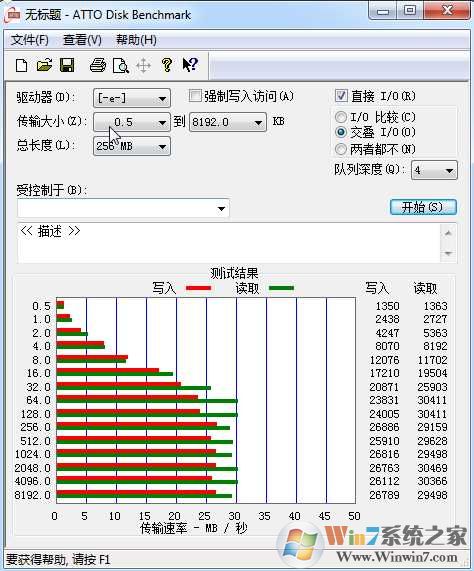 3、接着就是3.0U盘了,首先还是插在2.0接口上进行测试,此时传输速度已经有很大的提升,最高写入速度已经26.8MB/s,而最高读取速度也已经做到30MB/s左右。3.0的U盘确实是要比2.0好不少