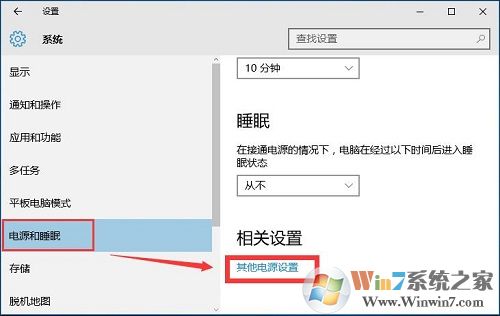 3、之后再点击左侧的“电源和睡眠”选项,然后点击右侧下方的“其他电源设置”,如图。