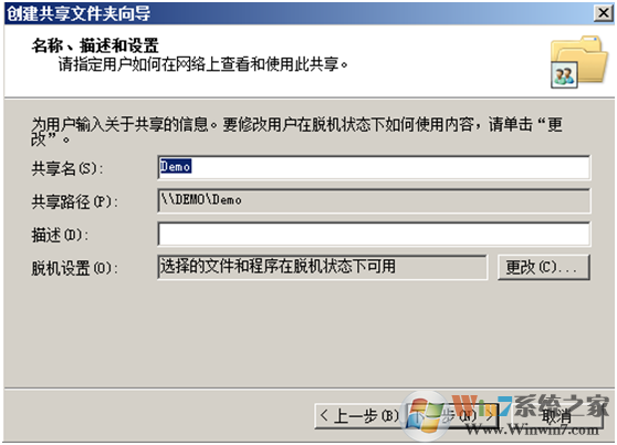 (3)单击“下一步”按钮,输入共享名称、共享描述,在共享描述中输入对该资源的描述信息,方便用户了解其内容。