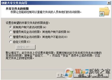 (4)单击“下一步”按钮,用户可以根据自己的需要设置网络用户的访问权限。或者选择“自定义”来定义网络用户的访问权限。单击“完成”按钮,即完成共享文件夹的设置。