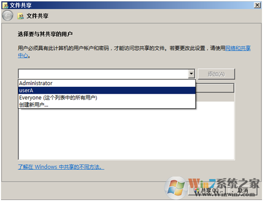 在“我的电脑”或“资源管理器”中,选择要设置为共享的文件夹,鼠标右键激活快捷菜单,将“共享”菜单项选中后,打开“文件共享”窗口,在该窗口进行相关的操作。