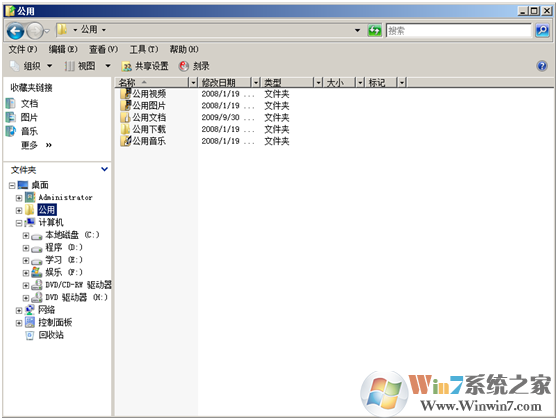 Windows Server 2008服务器系统中只有一个公用文件夹,选择“计算机 | 公用”命令后,即可打开公用文件夹窗口。