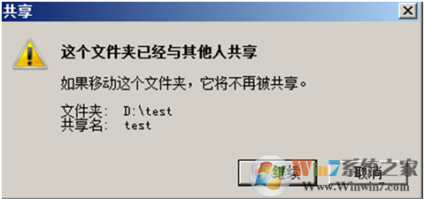 当共享文件夹被复制到另一位置后,原文件夹的共享状态不会受到影响,复制产生的新文件夹不会具备原有的共享设置。当共享文件夹被移动到另一位置时,将出现如图所示的对话框,提示移动后的文件夹将失去原有的共享设置。