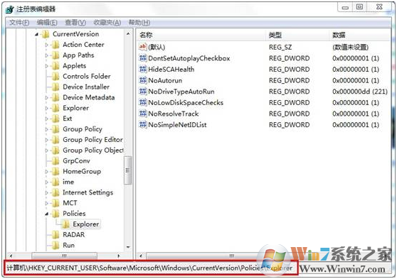 2.在打开的注册表编辑器中找到HKEY_CURRENT_USER\Software\Microsoft\Windows\CurrentVersion\Policies\Explorer键值。如下图所示