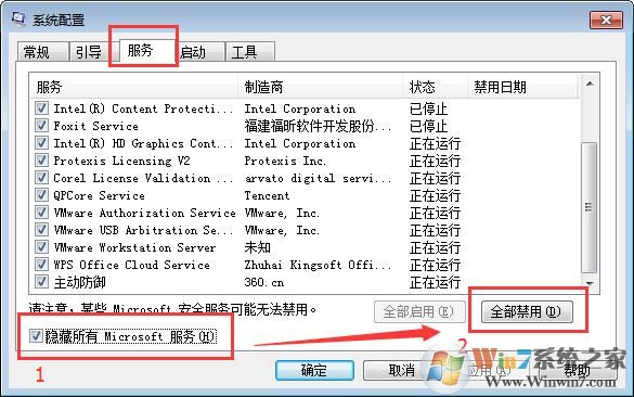 2、在打开的系统配置窗口中,切换到“服务”选项卡,勾选“隐藏所有Microsoft服务”后,点击“全部禁用”按钮。如下图所示: