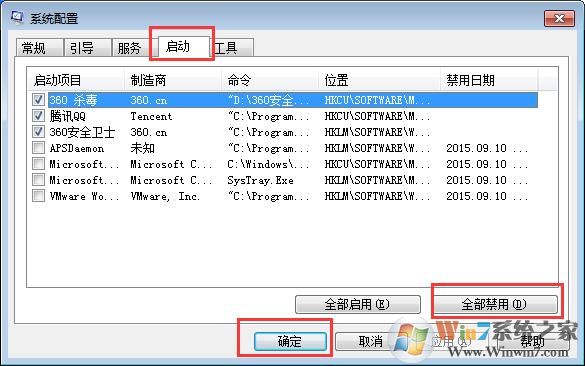 3、切换到“启动”选项卡,点击“全部禁用”,最后点击“确定”保存设置。如下图所示: