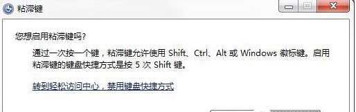 1、连续按5次shift,会出现如图的“粘滞键”窗口,点击“转到轻松访问中心,禁用键盘快捷方式”。