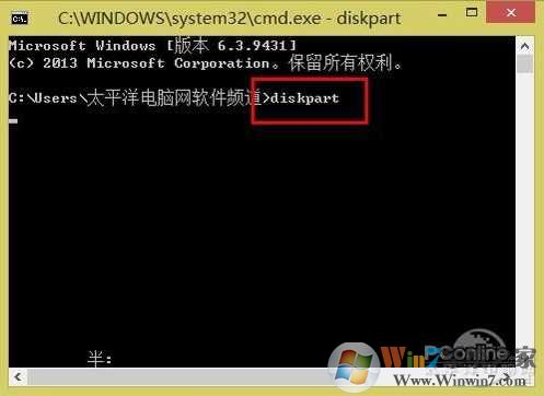 命令行提示符模式下直接输入“diskpart”