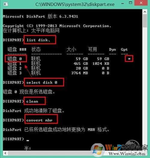 在Diskpart里输入"List Disk",然后输入“Select disk 0”(注:不一定是0,可能是1或者2,判断根据是看0是不是GPT磁盘)。