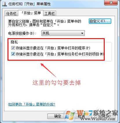 2、在打开的“任务栏和开始菜单属性“对话框里将”存储并显示最近在开始菜单中打开的程序“和”存储并显示最近在开始菜单和任务栏中打开的项目“前面的钩子去掉,如下图所示。