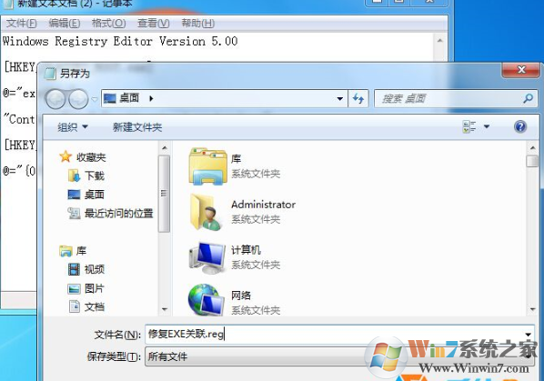 2、然后点击记事本上的文件,另存为,将文件格式设置为“所有文件”,并将该文件命名为 修复EXE关联.reg,保存在你可以找到的地方,如桌面;