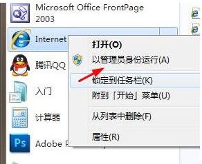 1、首先选择打开桌面的开始菜单按钮点击打开栏目,就可以看到我们的IE浏览器Internet Explorer点击右键打开操作栏,在打开的菜单中选择“以管理员方式”打开窗口;