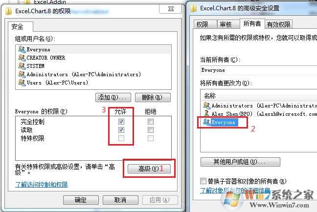 3.点击“高级”-“所有者”,选中“Everyone”,并勾选“替换子容器和对象的所有者”,然后点击应用,并将Everyone的权限未完全控制: