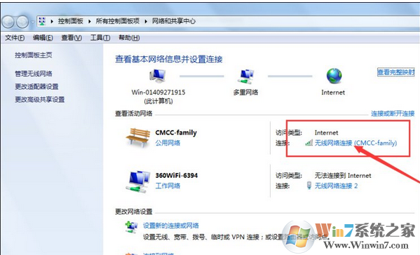 3、接着系统会弹出【网络和共享中心】的界面,找到右边的【无线网络连接】。