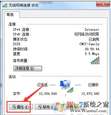 4、接下来在弹出的【无线网络连接状态】对话框中点选【属性】。