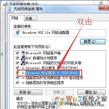 5、然后电脑会弹出【无线网络联=连接属性】对话框,在该对话框中双击选择【Internet协议版本4(TCP/IPv4)】。