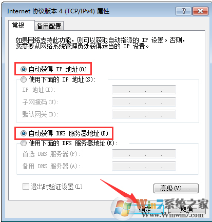 6、接着在【Internet协议版本4(TCP/IPv4)属性】对话框中选择【自动获得IP地址】和【自动获得DNS服务器地址】。
