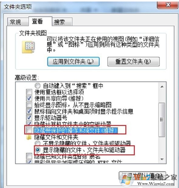 2、进去之后,点击“查看”,找到“隐藏受保护的操作系统文件”的勾选去掉,勾选“显示隐藏的文件,文件夹和驱动器”,如下图所示: