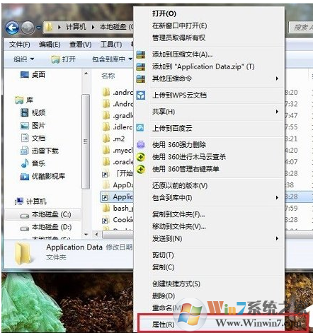 3、显示出来了Application Data文件夹后,右键点击“属性”。