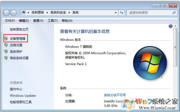1、在‘计算机“上单击右键,点击“属性”,然后点击“设备管理器”;
