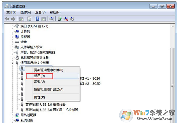 2、在设备管理器中,展开“通用串行总线控制器”,在“USB2 Enhanced”项上单击右键,点击“停用”,停用之后一般可以正常识别“unknown device”驱动。