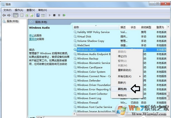 3、依次找到Windows Audio服务→启动。如果还是出错→双击打开(或点击属性)。