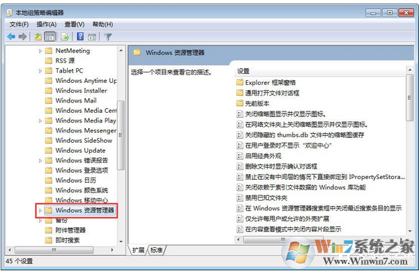 2、在“组策略”窗口中,我们可以看到在左边的窗口的“‘本地计算机’策略下面有“计算机配置”和“用户配置”两个选项,我们这里选择“用户配置”选项,并依次打开“用户配置”、“管理模板”、“WINDOWS组件”、“WINDOWS资源管理器”选项,这时我们会发现,在整个窗口的右边窗口中,出现了一些选项供我们选择;