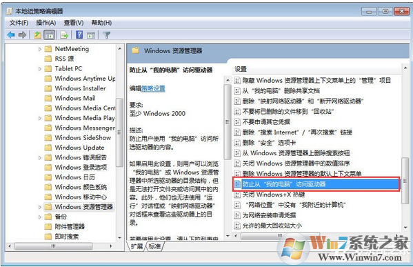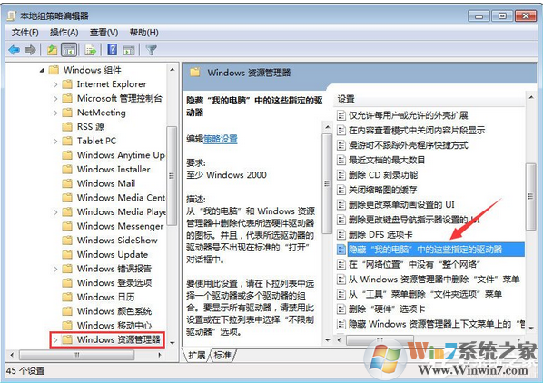 2、选择“用户配置”选项,并依次打开“用户配置”、“管理模板”、“WINDOWS组件”、“WINDOWS资源管理器”,在右边的设置窗口中,选择“隐藏我的电脑中这些指定的驱动器”项同样在它属性中,有三项选择,我们选择“已启用”项,然后在下面的下拉列表中选择需要隐藏的相应驱动器;