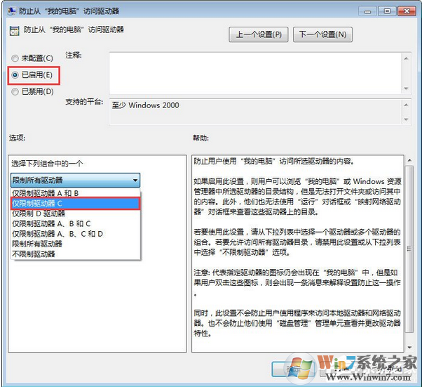 比如我们要限制C盘的使用,选中“仅限制驱动器C”,就可以了。如果希望关闭所有驱动器,可以选择“限制所有驱动器”。