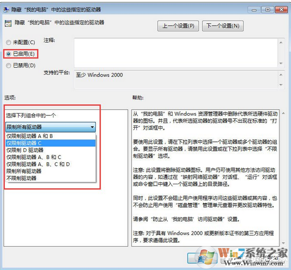 3、那么接下来我们在右边的设置窗口中,选择“防止从‘我的电脑’访问驱动器”项,并在这个选项上双击鼠标,接着出现“防止从‘我的电脑’访问驱动器的属性”设置窗口,选择“已启用”后可以看到,在下面就会出现选择驱动器的下拉列表,如果希望限制某个驱动器的使用,只要选中该驱动器就可以了。