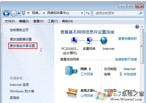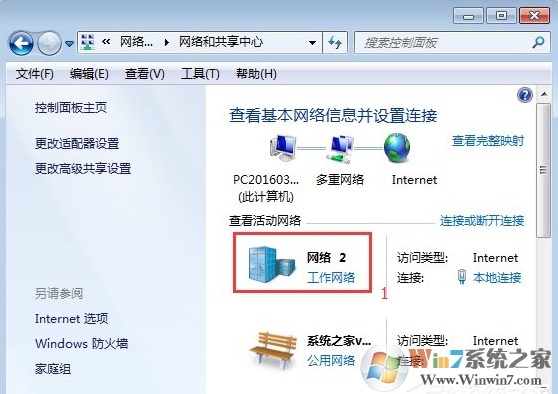 1、进入控制面板,选择“网络和 INTERNET”后进入“网络和共享中心”,如下图,把活动网络连接为“网络:工作网络”。