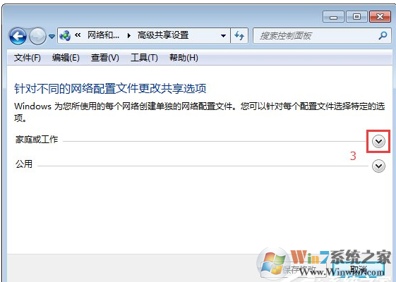 3、进入高级共享设置并且选择该箭头展开详细设置项(切勿选择“公用”,设置将不会生效)。
