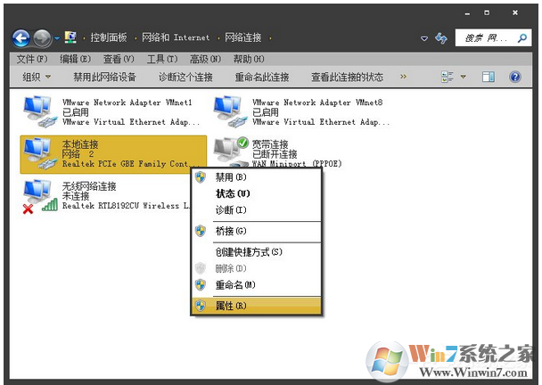 4、找到当前使用的适配器,鼠标右键单击,在下拉列表中选择“属性”。