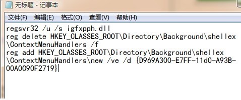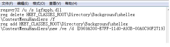 regsvr32 /u /s igfxpph.dll reg delete HKEY_CLASSES_ROOT\Directory\Background\shellex\ContextMenuHandlers /f reg add HKEY_CLASSES_ROOT\Directory\Background\shellex\ContextMenuHandlers\new /ve /d {D969A300-E7FF-11d0-A93B-00A0C90F2719}