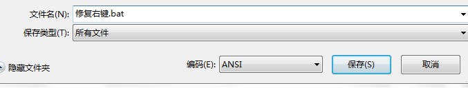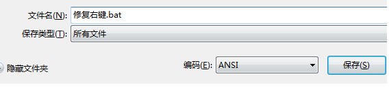 3、点击“文件”—“另存为”,将保存类型修改为“所有文件”,将文件名修改为“修复右键.bat”,点击保存;