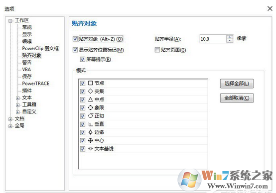 2、如绘图时如果暂时用不到贴齐功能,可以先禁用部分或者全部贴齐模式,以加快CorelDRAW X7的运行速度,如果需要此功能时点击开启即可,操作也是很方便。