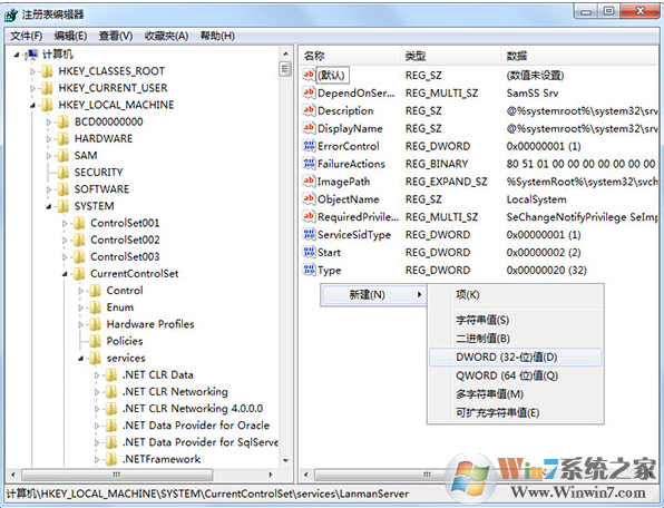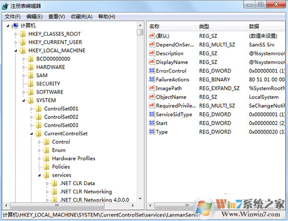 2、在注册表编辑器中依次展开[HKEY_LOCAL_MACHINE\\SYSTEM\\CurrentControlSet\\Services\\lanmanserver];如下图所示