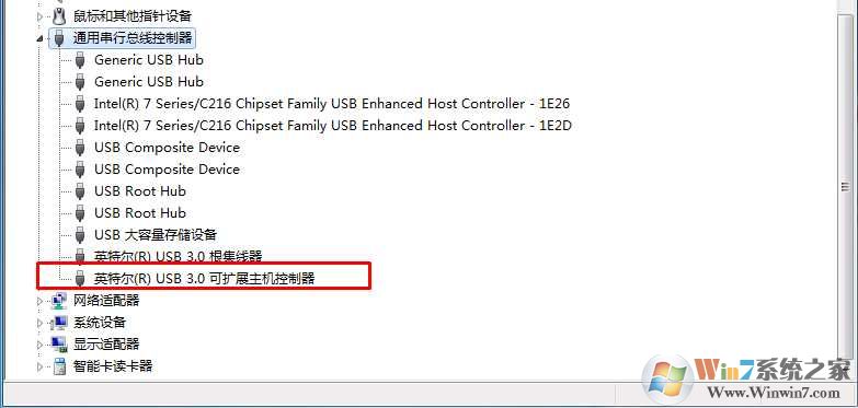 2、然后到设备管理器中,找到英特尔 USB3.0可扩展主机控制器;
