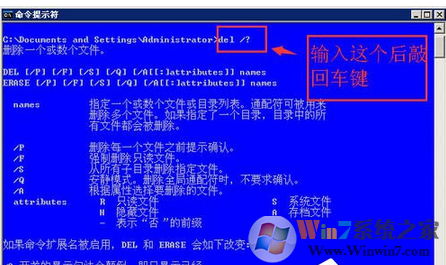 在弹出的黑色运行窗口里面输入图的:del /? ---》然后敲回车按键。