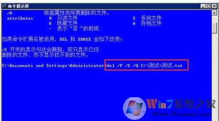 2、根据帮助信息得到命令使用方法便是:del [参数] [路径文件夹或目的文件]