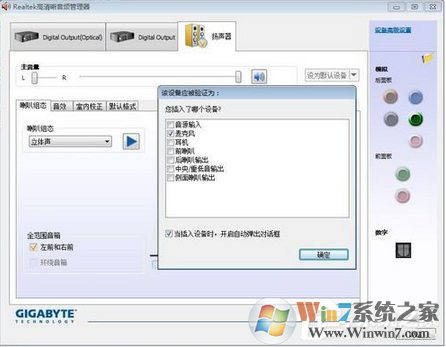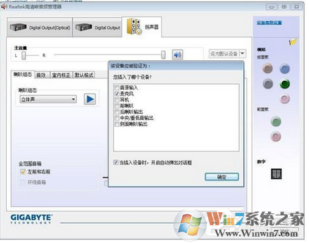 3、在上一步弹出的“目前连接的设备应辨识为”对话框,根据你插入的设备来选择就行,这里我们是插入音箱嘛,所以勾选音源输入即可,最后点击确定