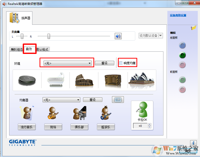 6、我们可以在此软件上设置相应的音效,让音效达到自己最舒服的效果,选择一下环境、然后将均衡度打钩