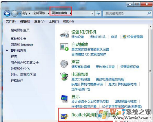1、先把你的音箱音频线拔下来,暂时不连接上,在控制面板中打开硬件和声音按钮,出现的界面如下图所示,点击其中的音频管理器: