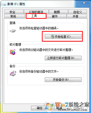 在文件夹所属磁盘上点击鼠标右键,然后在这个磁盘(U盘)的属性选项卡中,找到“工具”选项卡,然后点击“查错”选择夹中的“开始检查”按钮: