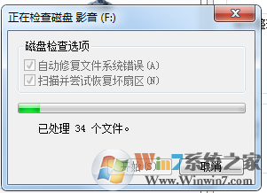 点击后会弹出“磁盘检查选项”,将“自动修改文件系统错误”和“扫描并尝试恢复坏扇区”前面的复选框都勾选起来,然后点击“开始”: