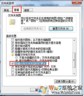 2、点击进入”文件夹选项“里面,找到查看----“隐藏已知文件类型的扩展名”如下图,把前面勾去掉