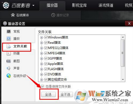 当然以上介绍的方法是某个后缀名的,假如某一类的后缀名文件都是同一个软件那不是要关联很多次?比如视频,音频文件。我们可以通过直接设置软件的文件关联,把需要关联的文件一次关联即可。