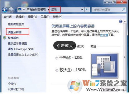 步骤二在弹出的窗口上找到“显示”按钮点击它然后在继续下一窗口上点击【调整分辨率】按钮如图所示